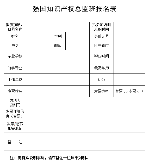 三、培训地点 中国职工之家 四、报名要求 1、在企业中从事知识产权、创新管理、法务等工作; 2、专职从事企业知识产权工作2-5年,从事企业知识产权管理一年以上; 3、职位为企业董事长、总经理、董事、研发部负责人、知识产权部负责人、标准化部负责人、法务部负责人及相关职位。 五、报名须知 1、报名后由研究院对报名材料进行资格审查,审查通过准予参加培训。培训原则上利用周末进行授课,资格审查通过人数达50人即可开班。 2、本培训收费包括资料费、餐饮费,交通费、住宿费等相关费用。3、填写申请表(见附件),根据要求填写发送至联系人邮箱sunxp@qgip.cn。 六、汇款帐户 收款户名:北京强国知识产权研究院 开户行:中国建设银行股份有限公司北京农大南路支行 账号:11001175800053001149 七、联系我们 北京强国知识产权研究院 2019年8月23日